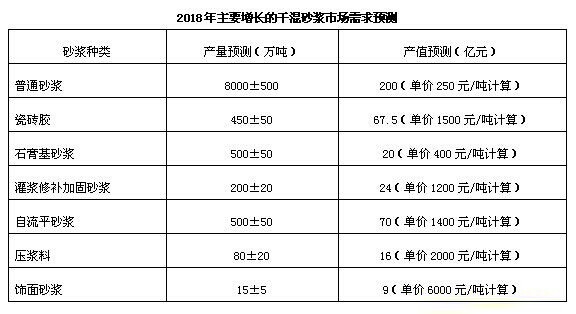 2013年,由于年初大面積、長時間的霧霾事件,引起了政府的高度重視,從國務院到各省市政府紛紛出臺大氣污染防治政策。“建筑揚塵”成為眾矢之的,禁止 現(xiàn)場攪拌砂漿的力度提升到前所未有的高度。從發(fā)展趨勢來看,無論建筑市場如何波動,干混砂漿都將保持兩位數(shù)的增長。未來幾年期內,我國干混砂漿市場將有一 個較快幅度的穩(wěn)定增長。經匯總專家、顧問意見,采用類比法、德菲爾法等綜合測算, 2018年各類砂漿市場預測統(tǒng)計: